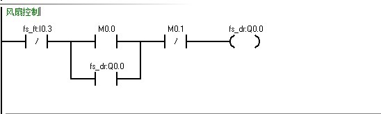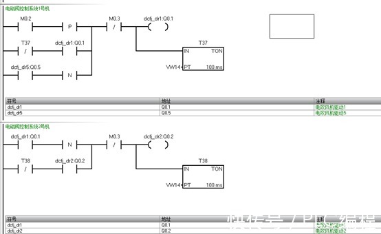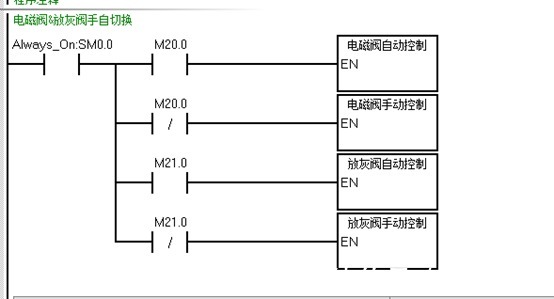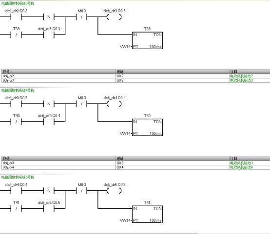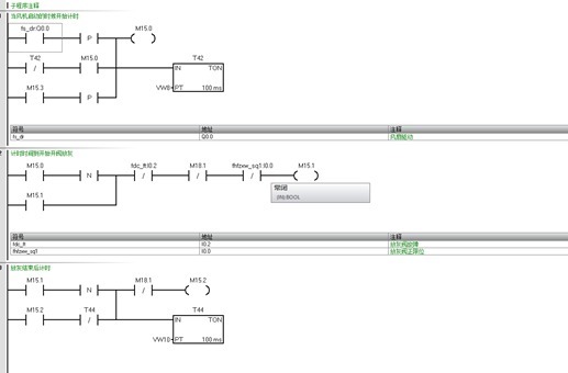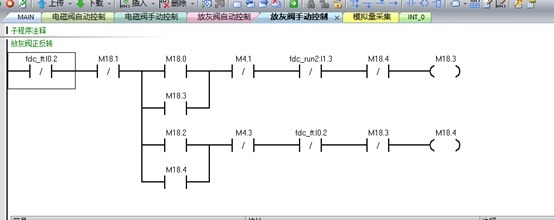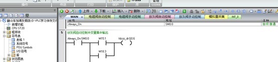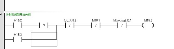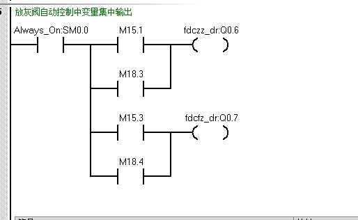 Q0.0为风扇DR当风扇启动时,触发M15.0常开变常闭第二段程序就导通了,M15.1输出,我们正转开始放灰,当触发到I0.0限位开关后M15.1失电产生一个下降沿,M15.2导通第三段开始执行,就是放灰计时放多久,定时结束后M15.2失电产生一个下降沿,第四段程序导通M15.3得电开始关阀,触发限位开关I0.1停止动作。